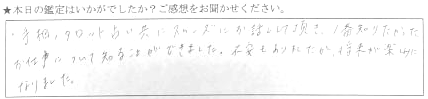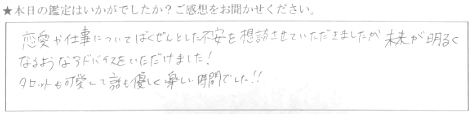 手相、タロット占い共にスムーズにお話しして頂き、1番知りたかったお仕事について知ることができました。不安もありましたが、将来が楽しみになりました。