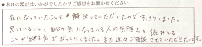 本当に素晴らしいアドバイスをいただきまして、ありがたかったです。またぜひ来店して、色々と的を得ていてびっくりしてしまいました。強く生きなければと思いました。